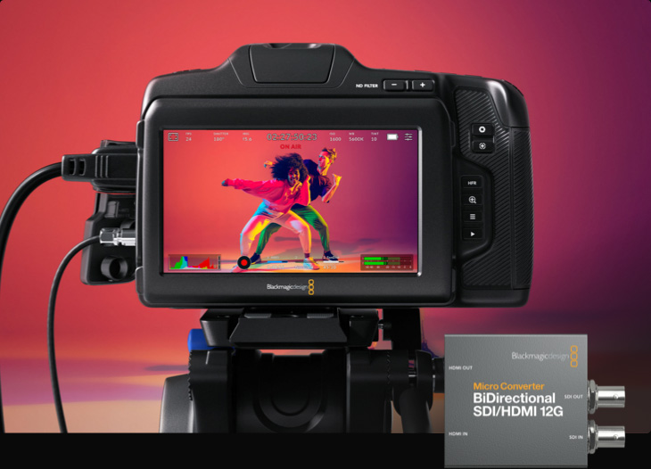 Los dispositivos Micro Converter BiDirectional SDI/HDMI permiten conectar unidades Blackmagic Pocket Cinema Camera a la entrada SDI del mezclador. A su vez, es posible transmitir una señal SDI de retorno a las cámaras y controlarlas a través de dicho enlace. Esto brinda pleno control del objetivo y permite realizar ajustes cromáticos o activar la luz piloto.