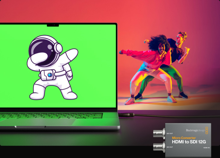 Los dispositivos Micro Converter HDMI to SDI permiten conectar los mezcladores directamente a un equipo informático para emplear gráficos con una calidad extraordinaria. Al crear un gráfico con un fondo verde, el compositor por crominancia brinda la posibilidad de superponer títulos sobre un fondo en directo. A su vez, los equipos informáticos funcionan muy bien como reproductores multimedia.