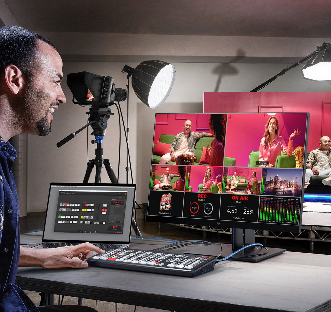 Compact live streaming switcher with 4 standards converted 3G-SDI inputs, built in hardware streaming, multiview, USB webcam, DVE, chroma key, media player and ISO recording of all 4 video inputs.