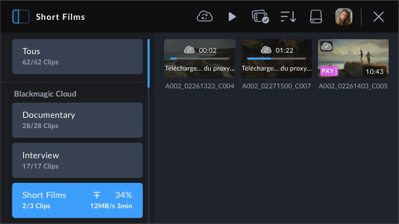 Si vous êtes hors ligne, vous pourrez parcourir les médias quand vous aurez accès à Internet et sélectionner manuellement les clips que vous voulez charger dans le Blackmagic Cloud.