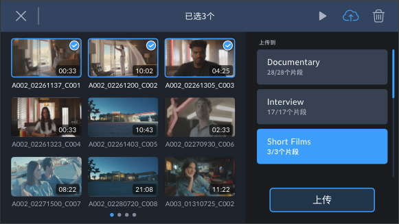 如果您处于离线状态,可以待联网后浏览媒体文件并手动选择想要上传到Blackmagic Cloud的片段。