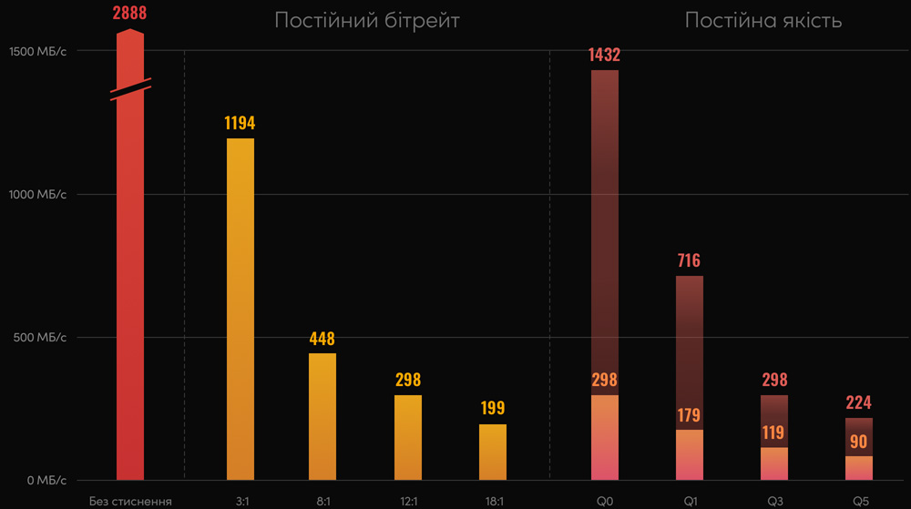Кодек Blackmagic RAW дозволяє використовувати одну з двох опцій кодування: з постійною якістю або з постійним бітрейтом. Вибір залежить від того, що важливіше на конкретному проекті — характеристики зображення чи розмір файлу.