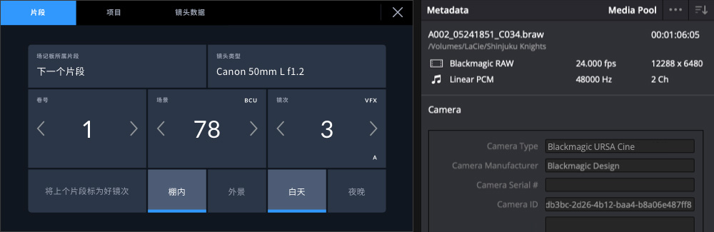 URSA Cine搭载数字场记板功能,因此您可以为任何镜头快速添加元数据信息!只要在内置触摸屏上左右滑动,就可以调出数字场记板界面。开始和停止记录时,场记板会自动递增镜次号码,因此您无需为每个镜头手动输入!您还可以将卷号设定为每次格式化存储卡时自动递增。镜头元数据可以自动或手动录入,包括制作信息、技术信息等内容。所有元数据都将保存为后期制作文件,可用于DaVinci Resolve等剪辑和调色软件!